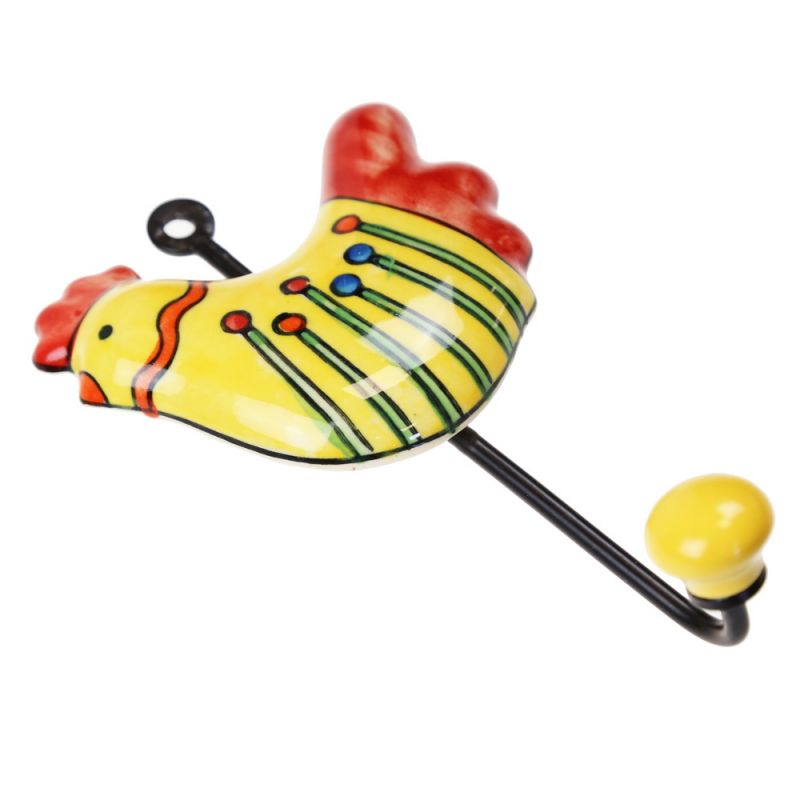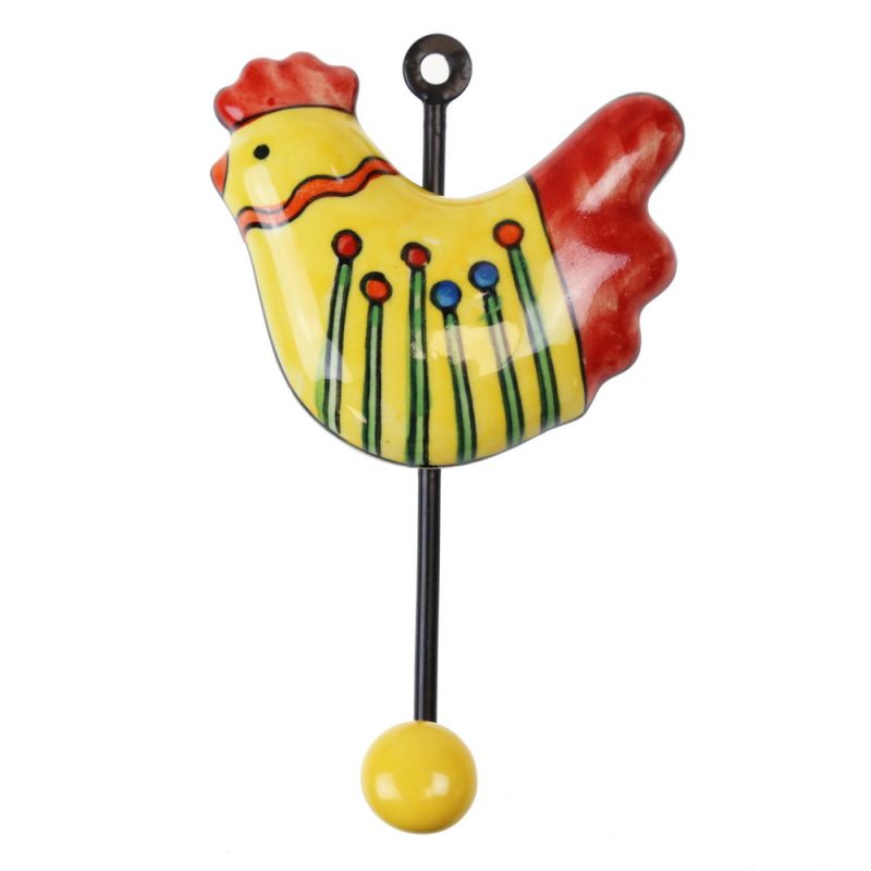 Wall hook with handmade ceramic rooster in bright yellow tones, decorated with colorful floral patterns. Adds a joyful, artisanal touch to any space. Size: 10x15cm.
